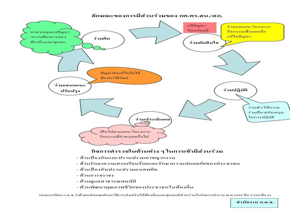 3. ภารกิจการมีส่วนร่วม เนื่องจากองค์กร กต.ตร.ในปัจจุบันเป็นองค์กรที่มีประชาชนในท้องถิ่น / ชุมชนเป็นกรรมการในสัดส่วนที่เท่า ๆ กันกับข้าราชการ ดังนั้นตามระเบียบ ก.ต.ช. ว่าด้วยหลักเกณฑ์และวิธีการส่งเสริมให้ท้องถิ่นและชุมชนมีส่วนร่วมในกิจการตำรวจ พ.ศ. 2549 จึงกำหนดให้ กต.ตร. เป็นองค์กรสำคัญมีบทบาทเป็นแกนนำในการให้ท้องถิ่น/ชุมชน เข้ามามีส่วนร่วมในการป้องกันปราบปรามอาชญากรรมและการรักษาความปลอดภัยในชีวิตและทรัพย์สินของประชาชน โดยกำหนดบทบาท ภารกิจของ กต.ตร.สน./สภ. กต.ตร.กทม. และ กต.ตร.จังหวัด ไว้ดังนี้